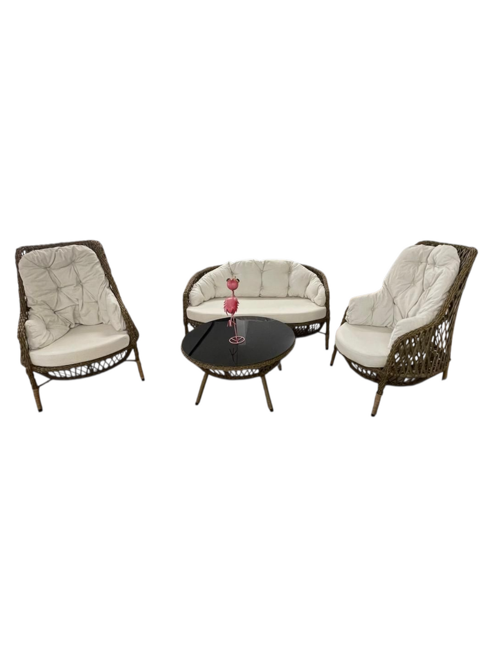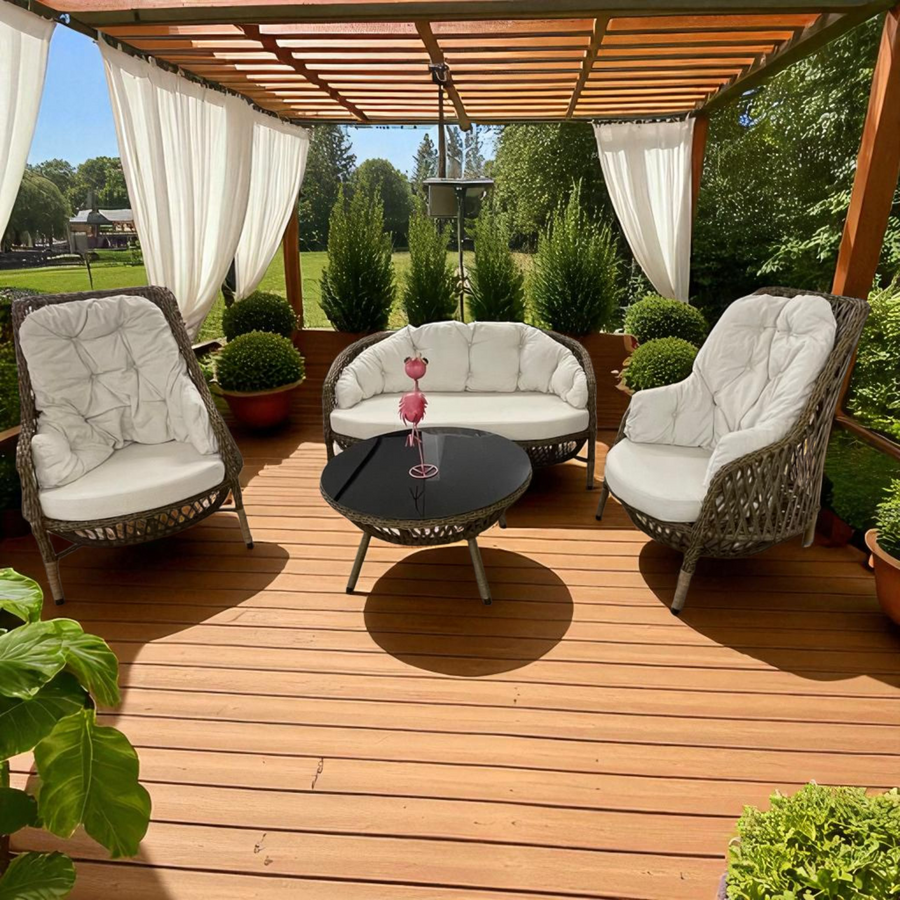 Ieškote patogaus ir stilingo baldų komplekto savo sodui, terasai ar balkonui? Šis 4 dalių lauko baldų komplektas sukuria jaukią poilsio zoną tiek mažesnėse, tiek erdvesnėse lauko vietose. Komplektą sudaro dvivietė sofa, du apvalūs foteliai ir derantis kavos staliukas su stiklo viršumi.