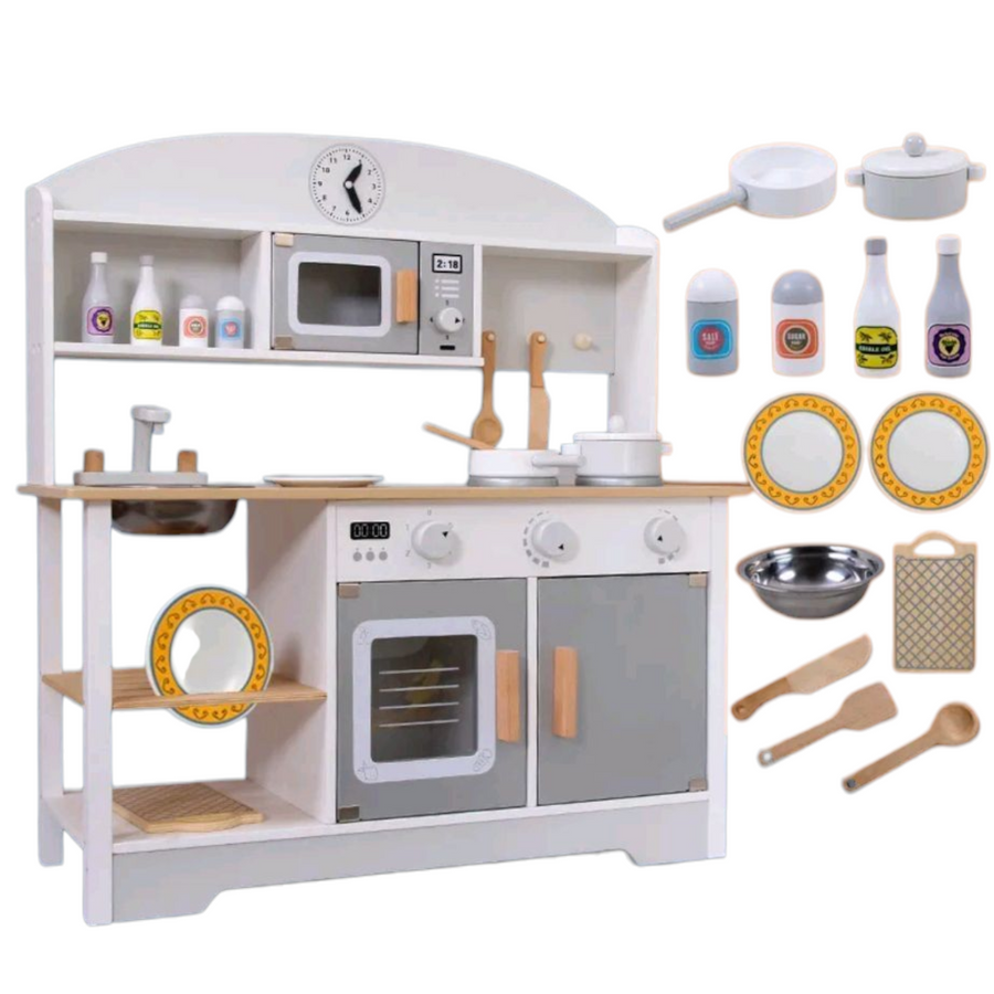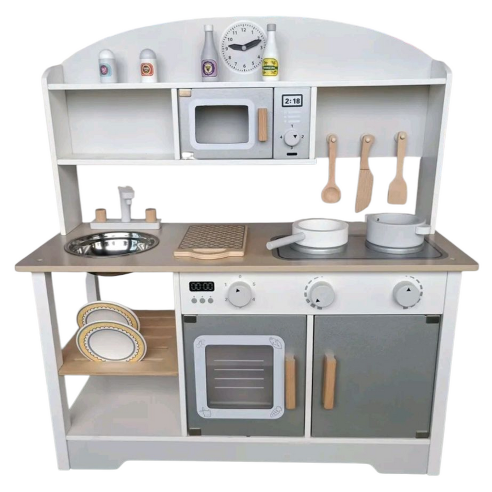 Ieškote kokybiškos ir saugios žaislinės virtuvėlės vaikui? Ši medinė vaikiška virtuvėlė – tai puikus pasirinkimas mažiesiems virėjams, kurie mėgsta žaisti namus, gaminti ir tyrinėti pasaulį per vaidmenų žaidimus.