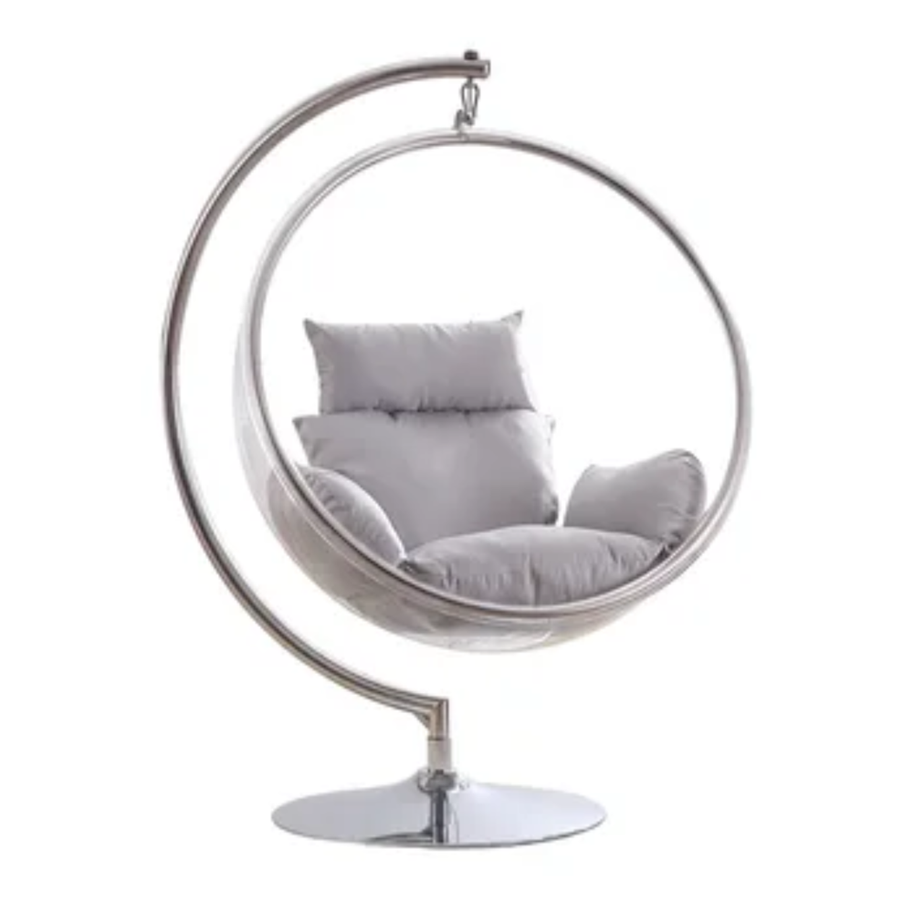Skaidrus korpusas sukuria erdvės pojūtį, o išlenktas rėmas su stabilia apvalia baze užtikrina saugų naudojimą. Minkšta pagalvėlė suteikia  atramą nugarai, galvai ir rankoms – tai baldas, kuris kviečia atsipalaiduoti.